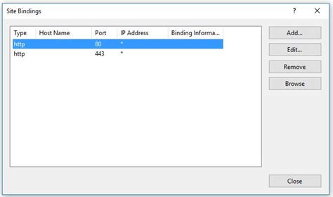 In the “Site Bindings” dialog, you’ll see a list of bindings for your website. Look for the binding with “Type” set to “http” and “Port” set to “80” . Select this binding and click “Remove” . Important: Make sure you only remove the HTTP binding on port 80. Removing the HTTPS binding will disable secure access to your site.