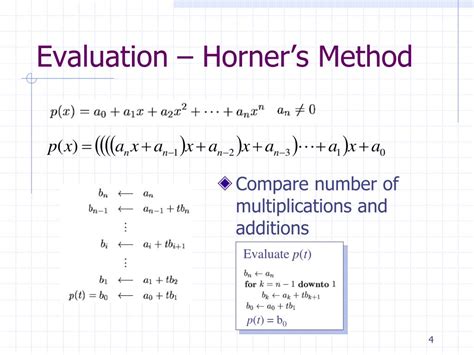 Additionally, because Horner’s method is computationally efficient, it can save valuable time and resources, particularly when dealing with large datasets or computationally intensive tasks. It provides a level of control over numerical precision that is often not available with standard built-in functions. The method’s simplicity also means that it is less prone to errors in implementation, making it a reliable and robust choice. By applying Horner’s method , you’re making a conscious choice to optimize both the performance and the accuracy of your numerical computations, providing you with more reliable results.