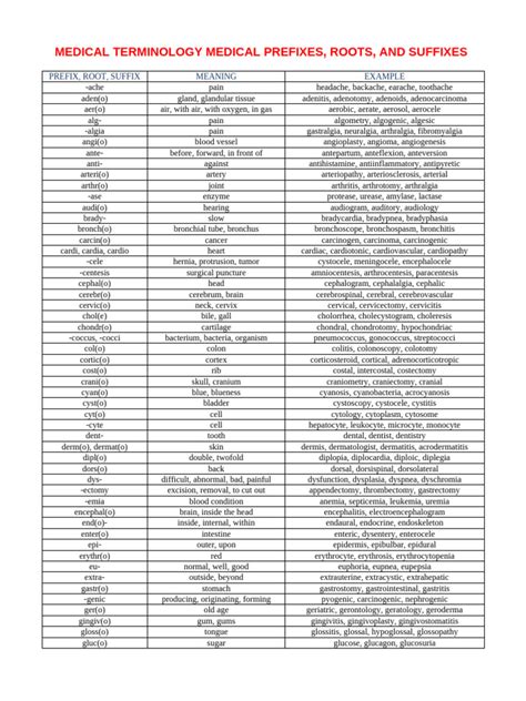Next up, we have prefixes . These are word parts that are added to the beginning of a root word to modify its meaning. They often indicate location, time, number, or a state of being. For instance, “hyper-” means high or excessive , so “hypertension” means high blood pressure . “Hypo-” is the opposite, meaning low or deficient , leading to “hypotension” or low blood pressure . Other common prefixes include “a-” or “an-” (without/lack of, like “anemia”), “brady-” (slow, like “bradycardia”), “tachy-” (fast, like “tachycardia”), and “peri-” (around, like “pericardium” - the sac around the heart). Memorizing a handful of these prefixes can instantly expand your understanding of a huge number of medical terms. It’s all about building blocks, guys!