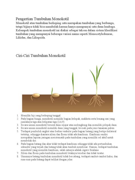Jadi gini, guys, tumbuhan berkeping biji tunggal alias monokotil ini adalah kelompok tumbuhan berbunga yang punya ciri utama pada bijinya. Sesuai namanya, biji mereka cuma punya satu kotiledon, atau bisa dibilang cuma punya satu kepingan lembaga. Bayangin aja kayak kacang tanah yang kalau dibelah jadi dua, nah monokotil ini cuma bisa dibelah jadi satu aja, nggak bisa dipisah jadi dua bagian yang sama besar. Kotiledon ini penting banget, lho, karena dia itu berfungsi sebagai sumber makanan cadangan buat embrio tumbuhan saat masih di dalam biji, sebelum akhirnya dia tumbuh jadi kecambah. Nah, karena cuma punya satu, struktur bijinya jadi lebih simpel. Hal ini berdampak pada perkembangan tumbuhan itu sendiri, mulai dari akar, batang, daun, sampai bunganya. Jadi, kalau kalian nemu tumbuhan dan penasaran dia masuk monokotil atau bukan, coba deh perhatiin bijinya kalau memungkinkan. Tapi, seringkali kita nggak perlu sampai membelah bijinya kok, karena ada ciri-ciri lain yang lebih gampang diamati.