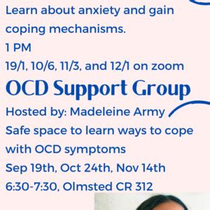 • Guest Speakers: Some support groups invite guest speakers, such as therapists, researchers, or individuals who have successfully managed their OCD. These speakers can provide educational information, share their expertise, and answer questions.
